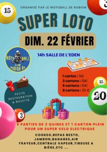 22 février 2026(1 évènement) Loto – Ce loto est organisé par le MBCR. Rendez vous à la salle de l'Eden à 14h00. Pour information, ce loto comprend 10 parties. Salle de l'Eden |