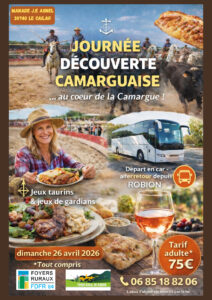 26 avril 2026(3 évènements) Concours Nature de tir à l'arc – Organisé par les Archers de Baude Rendez-vous sur le site de la glissette de 7h à 18h. La Glissette Visite de la manade Jean-Elie AGNEL - LE CAILAR 30740 avec le Foyer rural de Robion Tout le jour Transport aller-retour en car au départ de Robion à 8h45 à la pharmacie des Marronniers Formulaire d'inscription : cliquer ici Manade Jean-Elie AGNEL Visite de la Manade Jean-Yves Agnel au Cailar(Gard) – Organisée par le Foyer Rural avec un départ à 9h00 et un retour à 18h00 Sur inscription ( les places sont limitées, 75 euros par personne) renseignez vous au 06-85-18-82-06 |