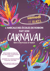 11 avril 2026(3 évènements) Assemblée Générale de la FNSMR – Organisée par le CDSMR84 Rendez vous à la salle de l'Eden de 14h00 à 18h00. Salle de l'Eden Carnaval Comme chaque année l'association Amicale des Ecoles organise le Carnaval de Robion. Rendez vous à partir de 15h sur la Place St Roch.