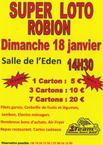 Ce super loto est organisé par l'association Robion Sport Auto le 18 Janvier à la salle de l'Eden à partir de 14h30. Un loto avec 10 parties et de nombreux lots à gagner . Réservation possible au 06-74-50-72-50 ou au 07-88-56-13-90